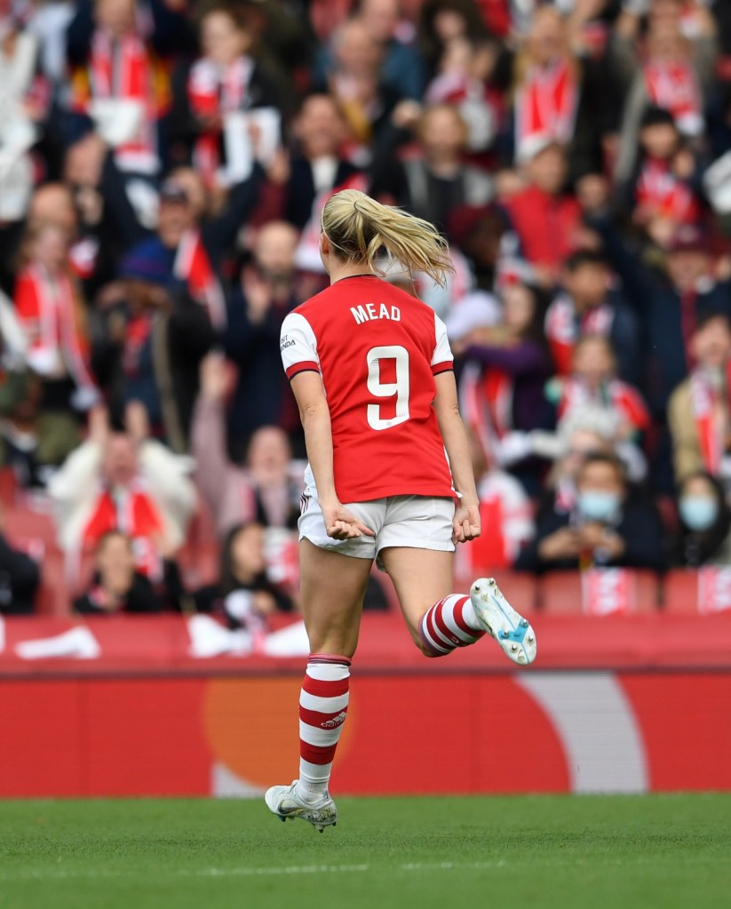 Above: Beth Mead celebrates after giving the Gunners an early lead. Photo: Arsenal WFC.
