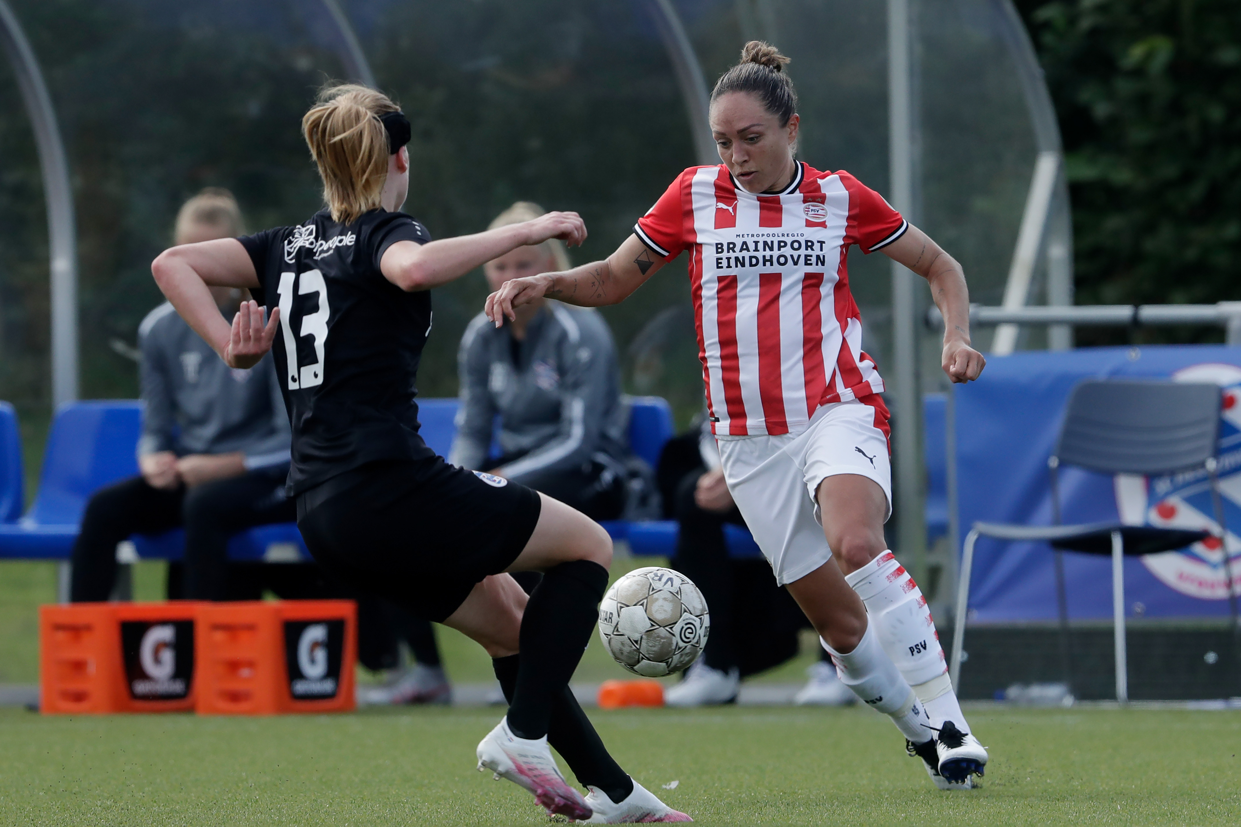 HEERENVEEN, NETHERLANDS – SEPTEMBER 13: (L-R) Wielle Douma of SC Heerenveen Women, Kyah Simon of PSV Women during the Dutch Eredivisie Women match between SC Heerenveen v PSV at the Abe Lenstra Stadium on September 13, 2020 in Heerenveen Netherlands (Photo by Eric Verhoeven/Soccrates/Getty Images)
