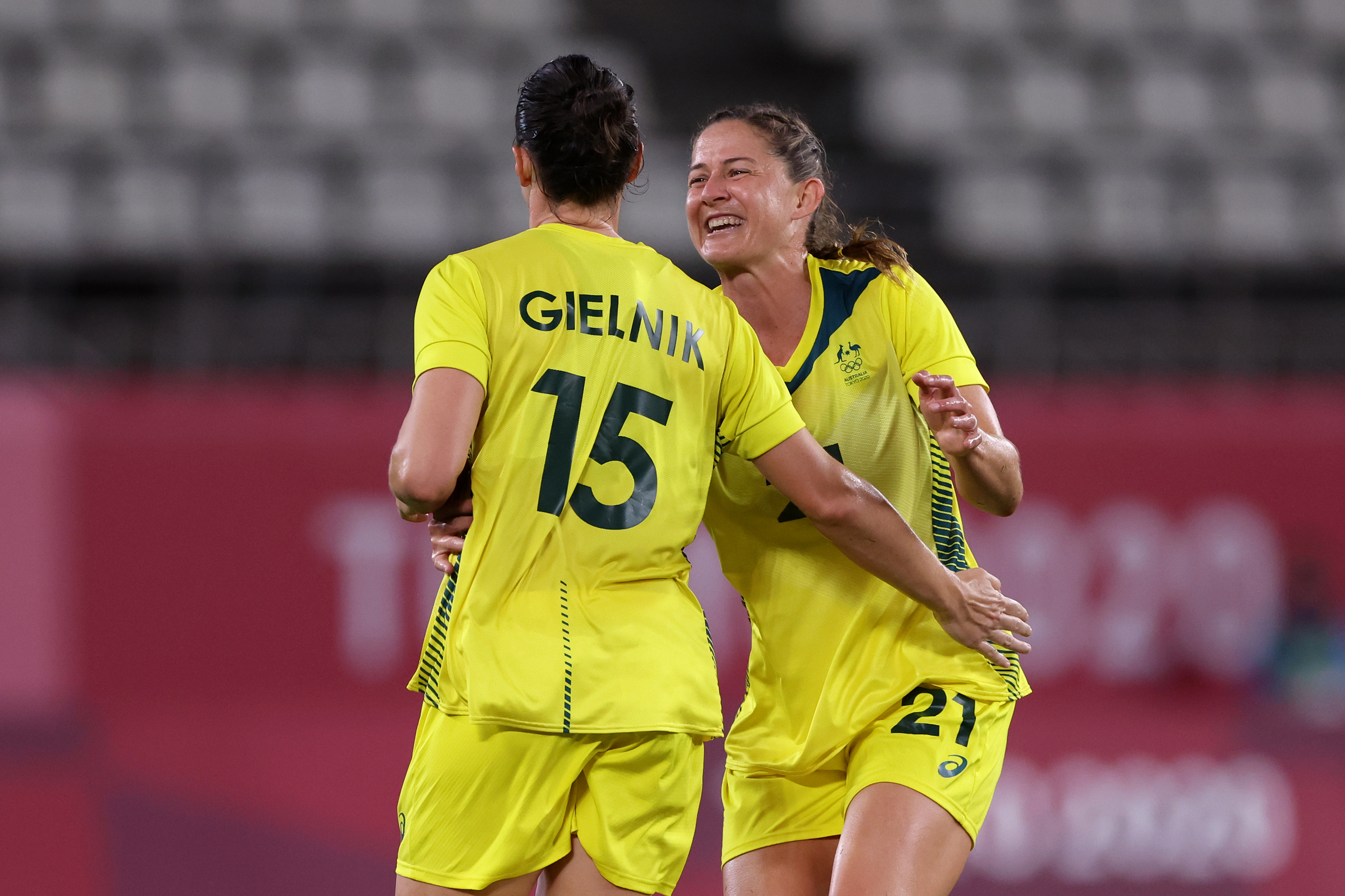 KASHIMA, JAPAN – AUGUST 05: Emily Gielnik #15 of Team Australia celebrates with Laura Brock #21 after scoring their side’s third goal during the Women’s Bronze Medal match between United States and Australia on day thirteen of the Tokyo 2020 Olympic Games at Kashima Stadium on August 05, 2021 in Kashima, Japan. (Photo by Elsa/Getty Images)